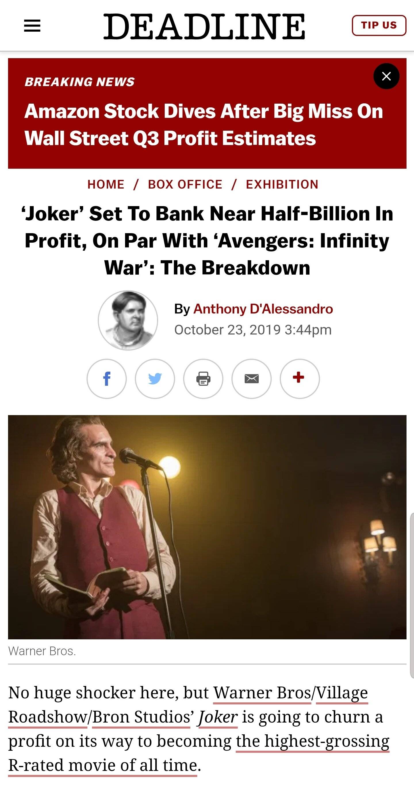 데드라인에 따르면 조커의 순이익은 블랙팬서와 인워에 근접 할 것으로 예상됨