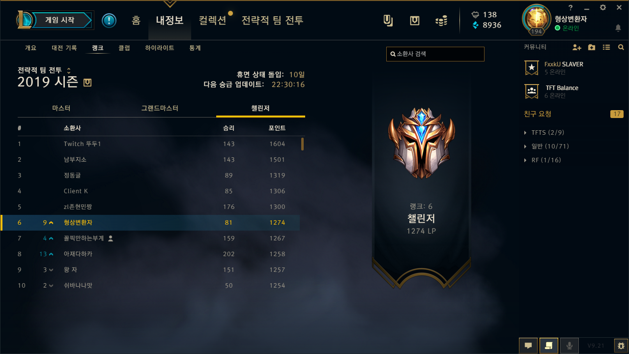 챌 상위권 이제 안 돌릴거고 나도 본부캐 다 휴면일수 맞춰놨으니 PBE나 깔짝거리던가 협곡으로 가야지