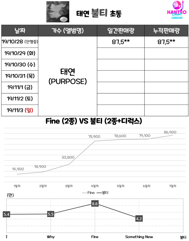 기존 여솔 초동 1위 기록이었던 본인의 정규 1집 86,9xx장을 오늘 정규 2집 발매 하루만에 넘기면서 여솔 초동 기록 갱신