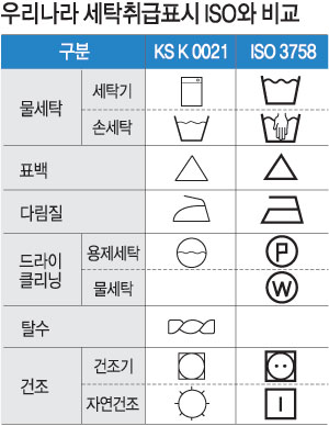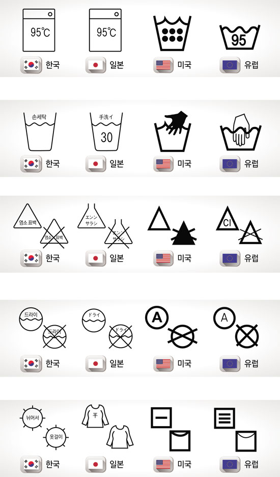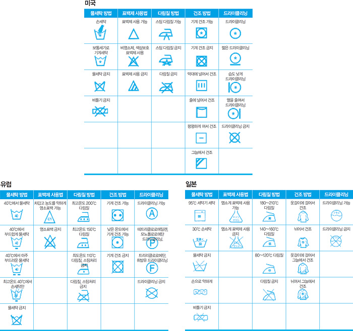 왼쪽부터 물온도 40도씨로 세탁 가능, 세탁기 손세탁 가능. 어떠한 표백재도 사용 금지. 기계건조 사용 불가. 그늘에서 평평하게 펴서 건조. 스팀 다리미 가능(?) 이건 엑스인지 아닌지 확인이 안되는데 엑스면 불가능임. 드라이클리닝 금지. ㅇㅋ