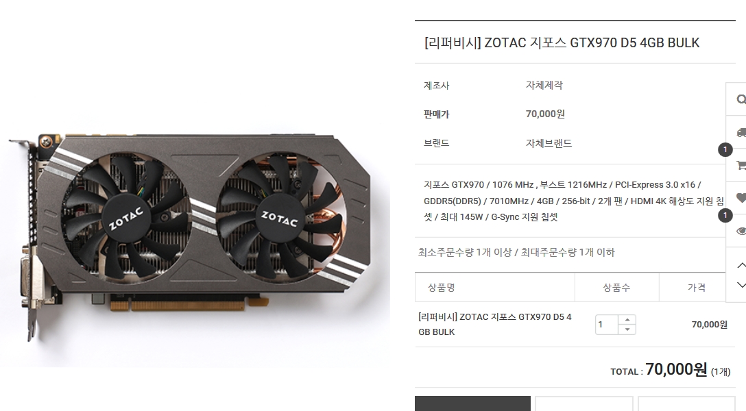 970 자체가 나빠서 사지말라는게 아님 판매처건 조텍이건 as가 남아있더라도 970 자체가 물건이 없는데 as가 될수도 없고 그와중에 리퍼라서 언제뒤질지 모르는 폭탄인데 굳이 저걸 살 이유가 단 한개도 없음 1060 리퍼면 더 안돼 광부에디션이거든