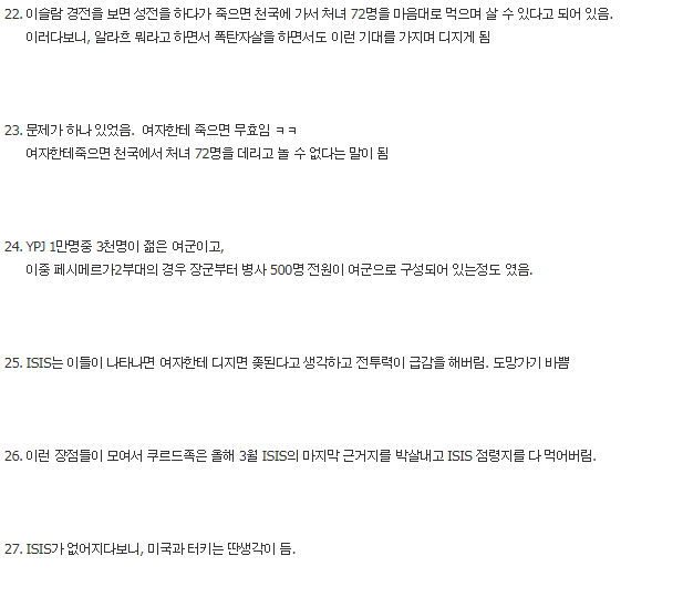 20. YPJ(인민수비대)는 미군무기와 군사교육 외에도 큰 무기가 하나 더 있었음.