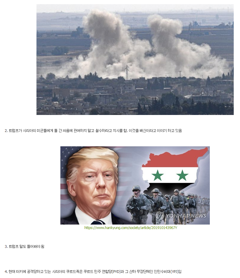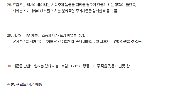 얼마전 트윗 보는데 미국에서 내부고발자가 한 얘기가 뉴스 나온다는데 트럼프 사위가 사우디랑 통화해서 미국서 활동하던 사우디 언론인을 체포해도 된다고 했대 그걸 터키가 도청해서 트럼프한테 미군 철수하라고 압박했다고 하는 그런 내용이었음 일종의 약점잡힌 상태? 루머이긴한데 갑작스런 철수라 그럴싸하긴 함