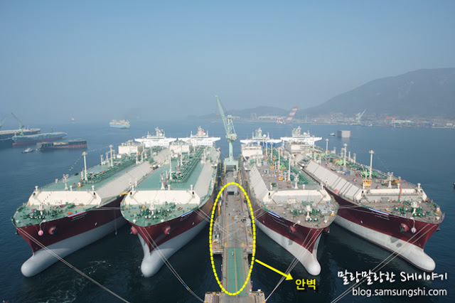 12. 삼성조선의 경우 8킬로 안벽이라면 일반 배는 연간 100척이상을 만들 수 있는데, LNG운반선은 30척 정도 밖에 못 만든다는 말임(물론, 배를 이중으로 붙이든지 하는 편법이 있지만, 안벽에 바로 붙이는 것보다 비용이 많이 드는 방법임)