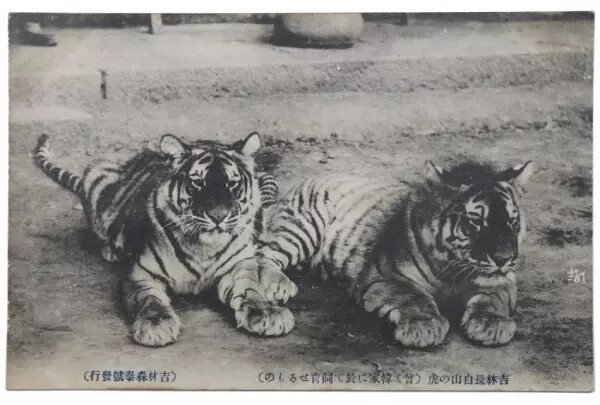 【서울=뉴시스】 신동립 기자 = ‘애완용 호랑이’ 사진엽서가 경매에 나왔다. 조선시대 백두산 지역 민가에서 사육한 호랑이 2마리를 찍은 ‘길림 장백산의 호랑이 회엽서’다.