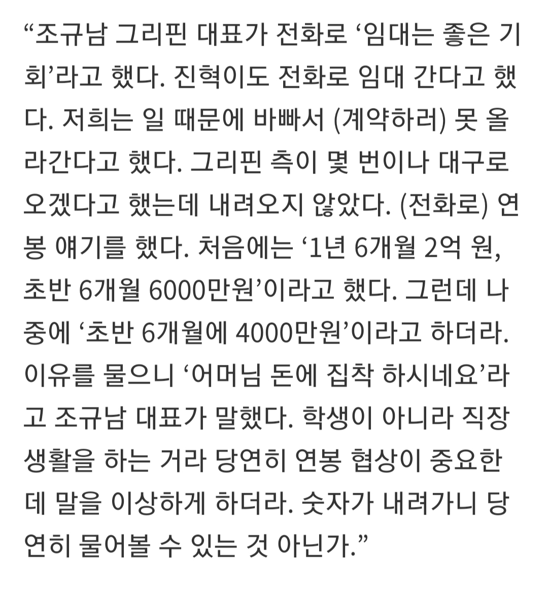 처음에는 ‘1년 6개월 2억 원, 초반 6개월 6000만원’이라고 했다. 그런데 나중에 ‘초반 6개월에 4000만원’이라고 하더라. 이유를 물으니 ‘어머님 돈에 집착 하시네요 라고 조규남 대표가 말했다. 시발 진짜 ㅋㅋㅋ