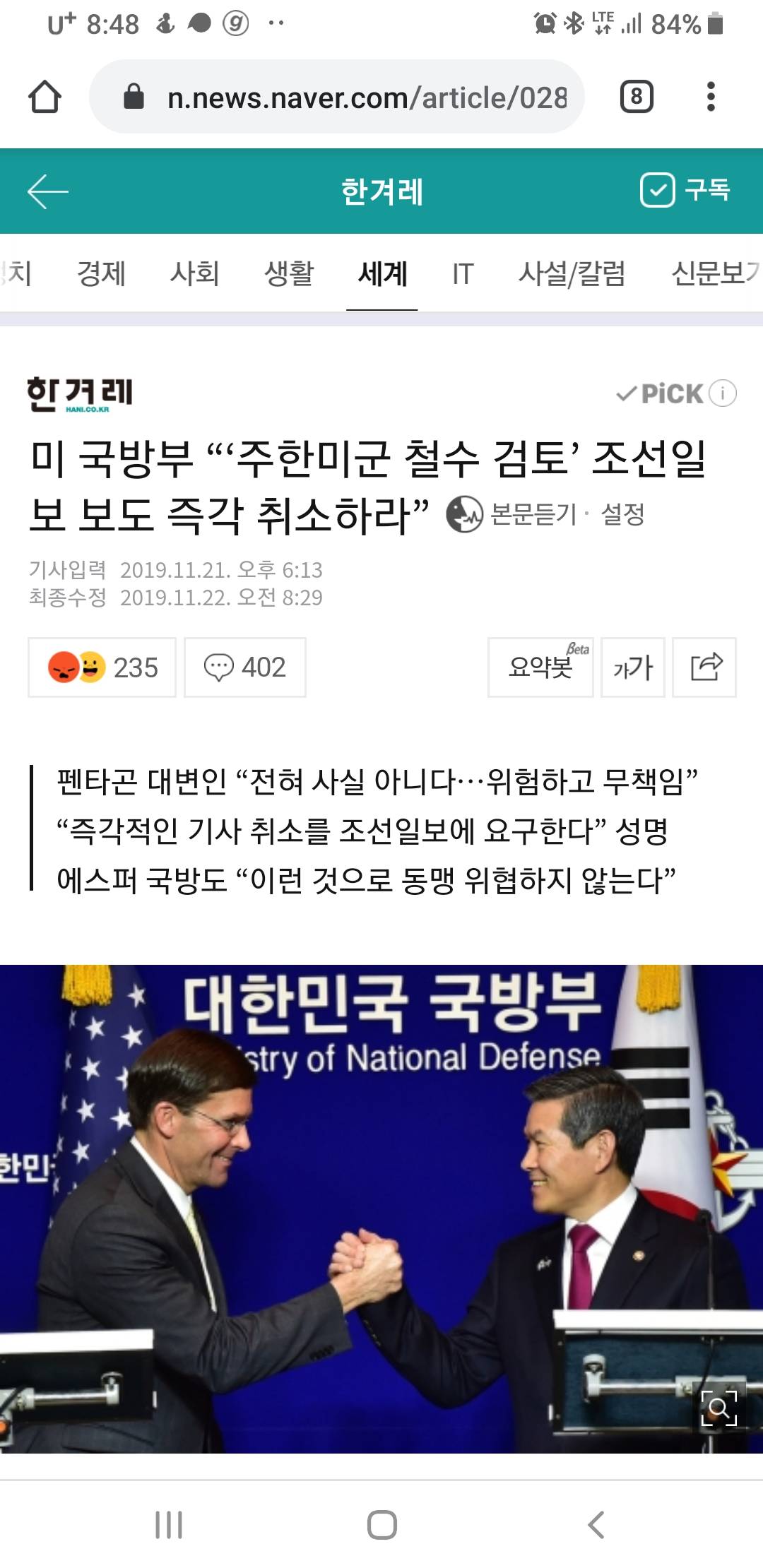 그럴 가능성은 거의 없는게 다른 믿고 거르는 신문사인 경향일보발이긴하지만 그들 인용에 따르면 미 국방부과 직접 조선 일보에 보도 철회 요구함