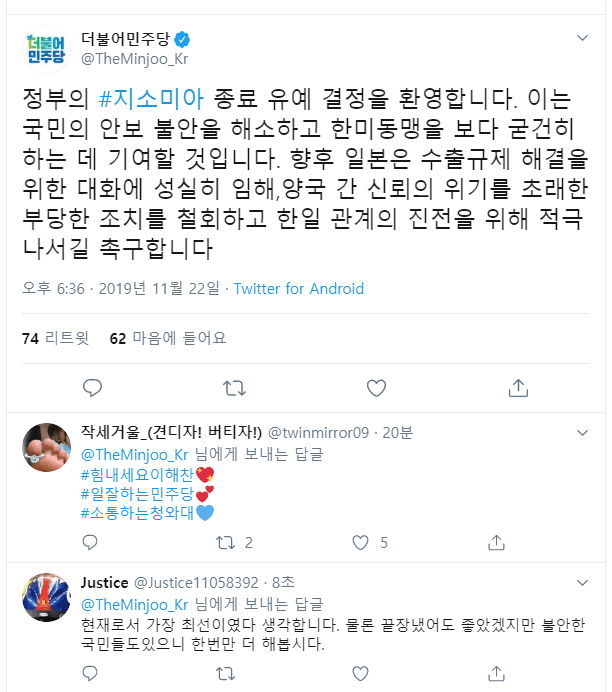 - 언제든 지소미아 종료 권한이 있다는 건데, 일본이 어떤 태도를 보였을 때 지소미아를 연장한다는 건가.▶간단히 설명한다. 7월1일 이전의 상황으로 복귀해야 한다. 화이트리스트에 다시 한국을 포함해야 한다. 3개품목에 대한 규제가 철회되어야만 지소미아를 연장할 수 있다. WTO 제소를 철회할 수 있다. 언제 그런 상황에 도달한다는 것을 예단키는 어렵다. 하지만 상당기간 지속은 우리가 허용할 수 없다.