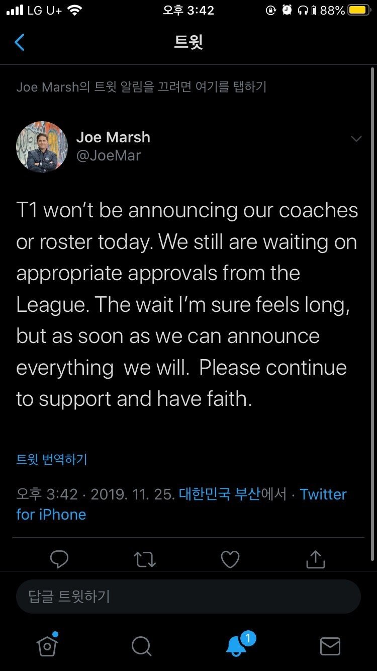전문 다 해석하자면 T1 측에서는 오늘 코치랑 로스터 공개 안할거다. (뭣 때문인진 몰라도) League 측에서 적절한 승인을 해줄때까지 대기중이다. 기다리는게 좀 에바쎄바일진 몰라도, 곧 발표할테니까 믿고 땡겨봐라 좀;;