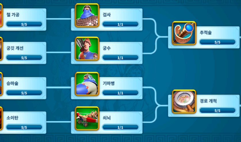 초반에나 뭘 먼저 해야하나 혼란올뿐 족밥시기만 지나가면 어련히 다 자연스럽게 된다. 채집쪽은 일단 찍지말고 군사쪽만 찍으셈. 채집쪽은 탐색돌아서 나오는 민가에서 기술줌.