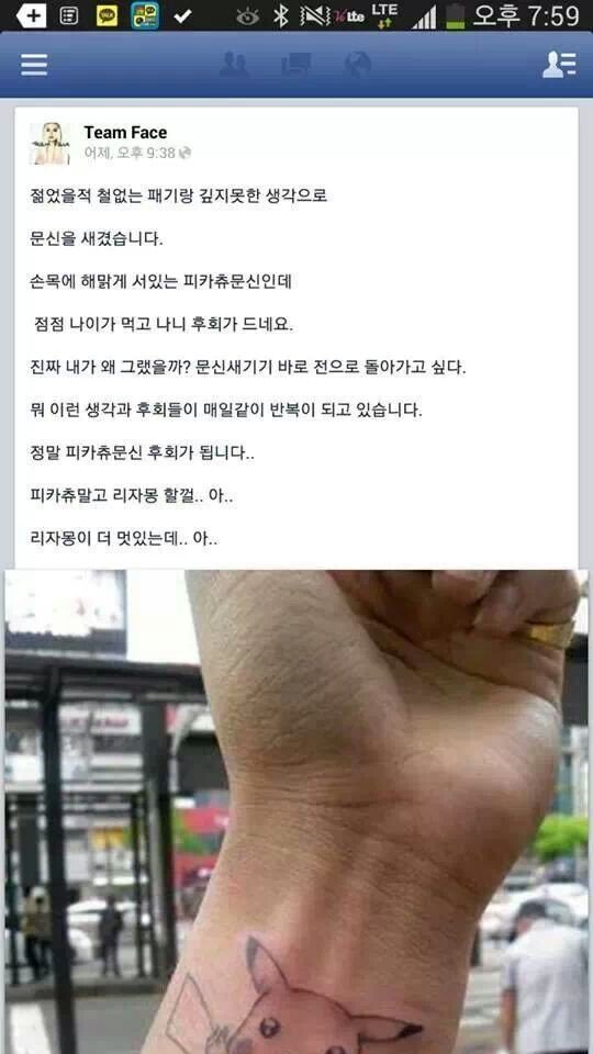 장난스럽게 썼지만, 문신 자체가 아니라 다른 디자인으로 할걸 하고 후회하는 사람 많더라 어쨋든 후회는 후ㅗ히
