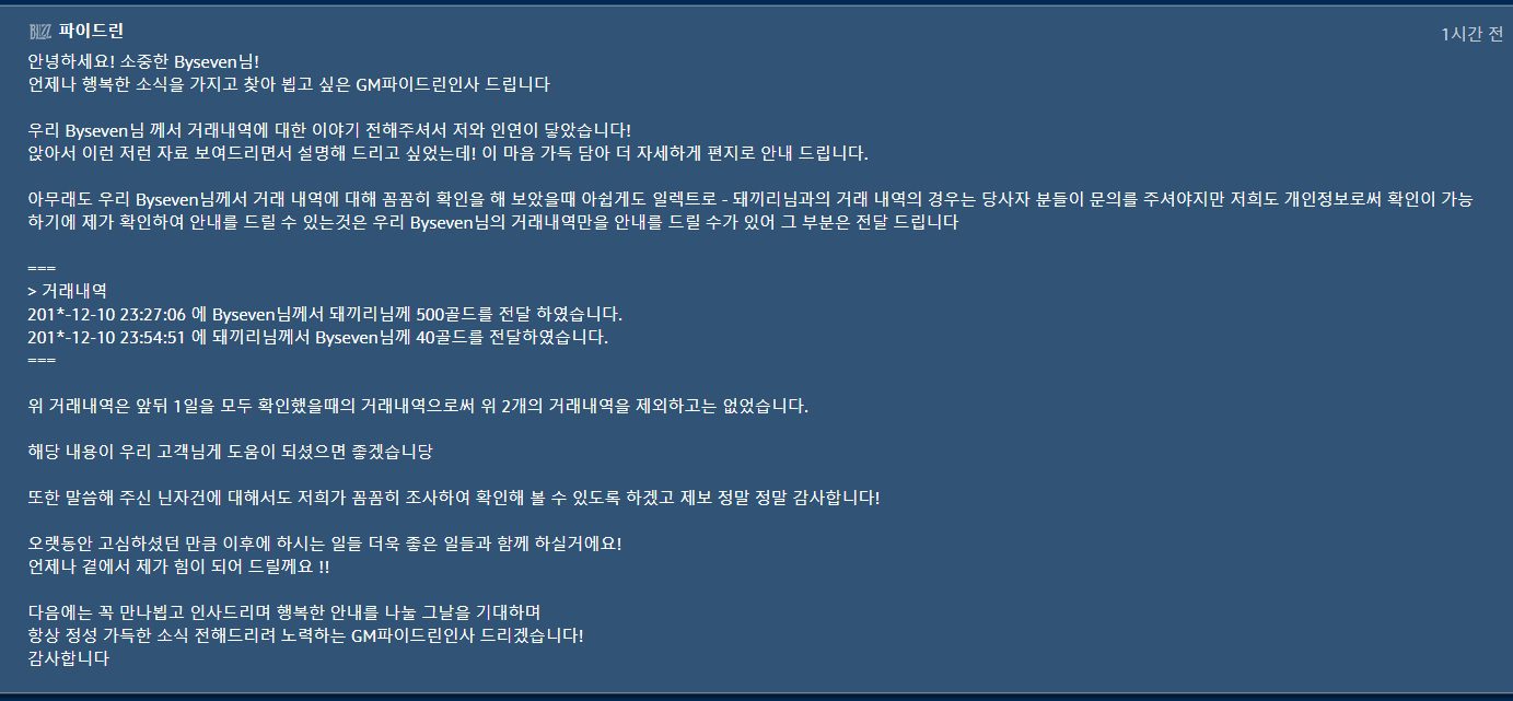 그 상황에서 억울하게 닌자 공대장의 공범으로 오해받는 상황이 생겨서 거래 내역에 대한 해명/증명을 요청합니다.