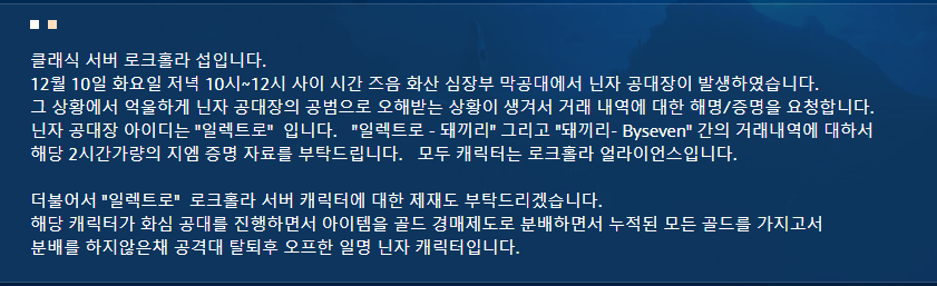 더불어서 "일렉트로" 로크홀라 서버 캐릭터에 대한 제재도 부탁드리겠습니다.