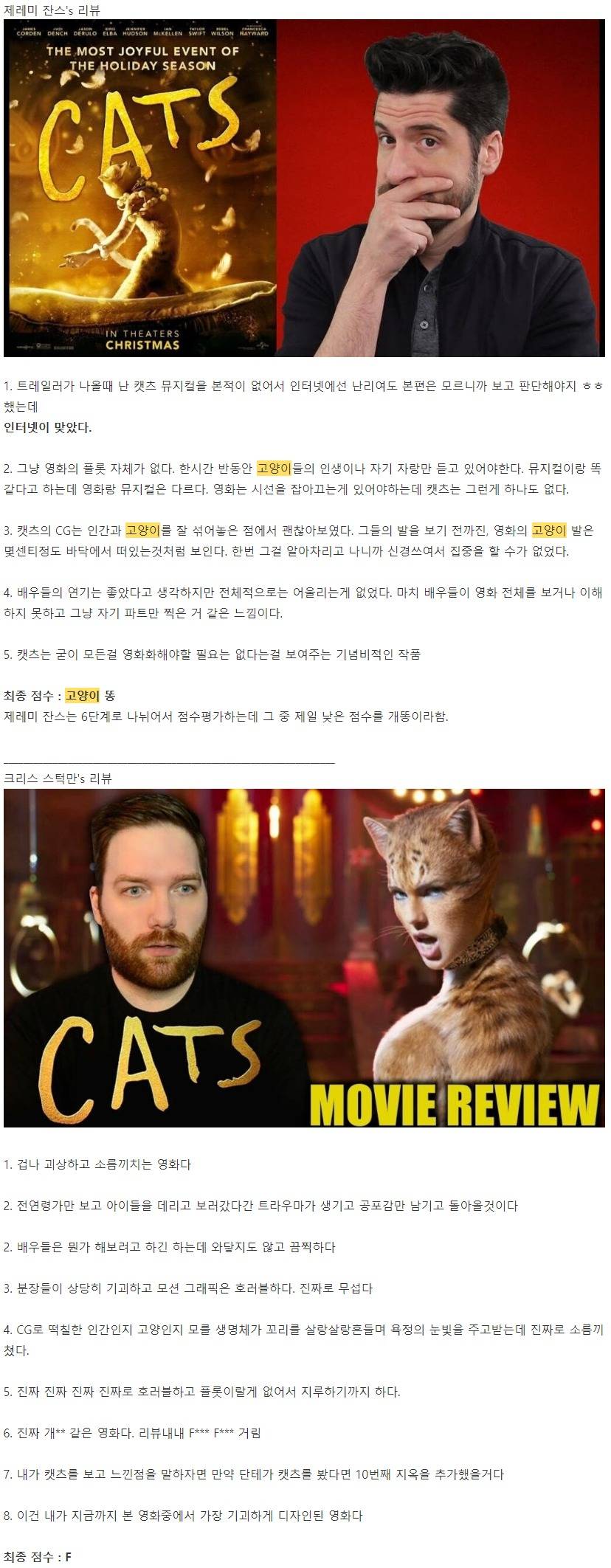 뮤지컬은 재밌었는데 왤케 영화는 혹평인지 나도 이해를 못하다가 바퀴벌레 분장한거 영화에서 진짜 팔 4개로 cg처리한거보고 납득함