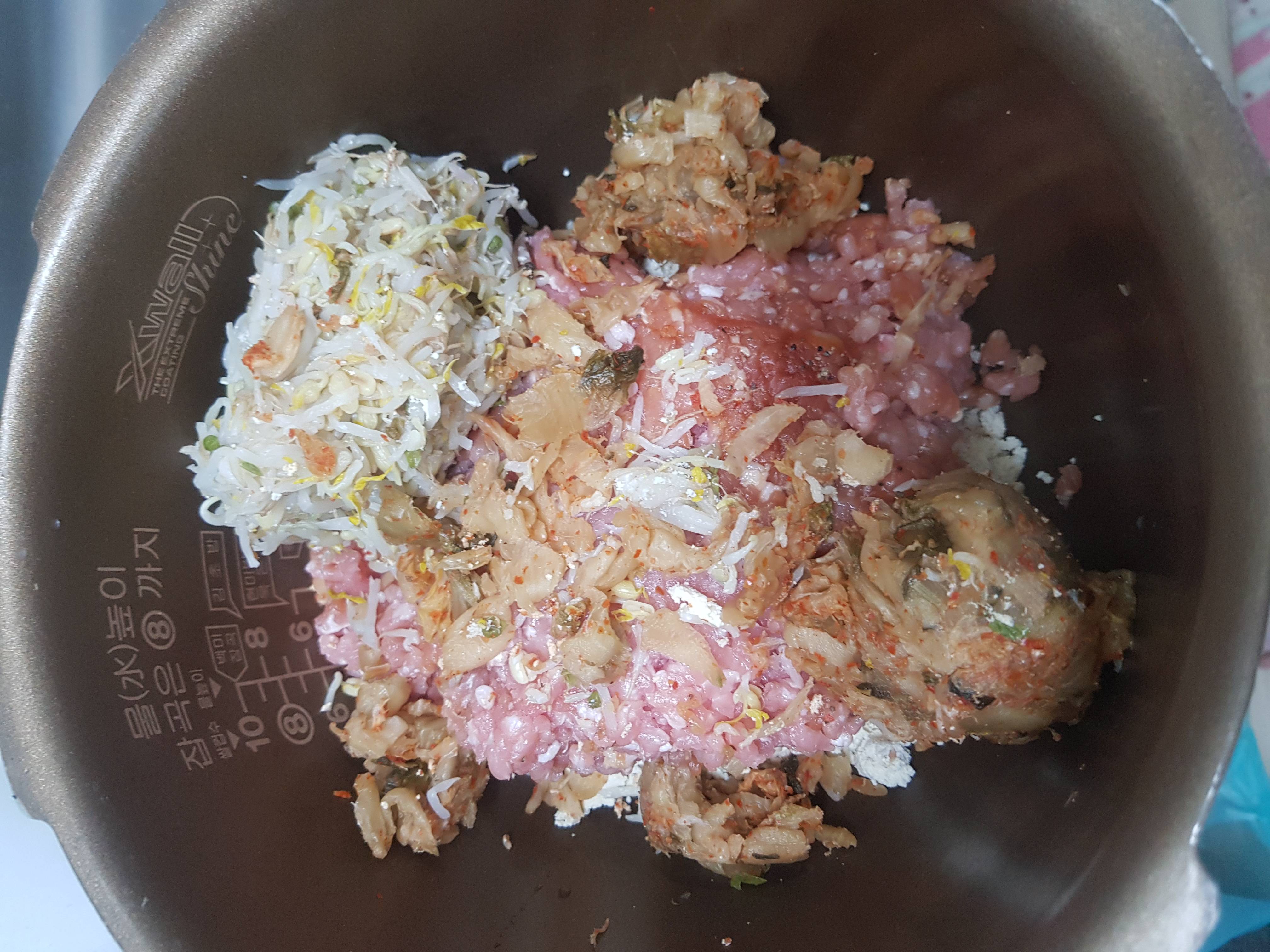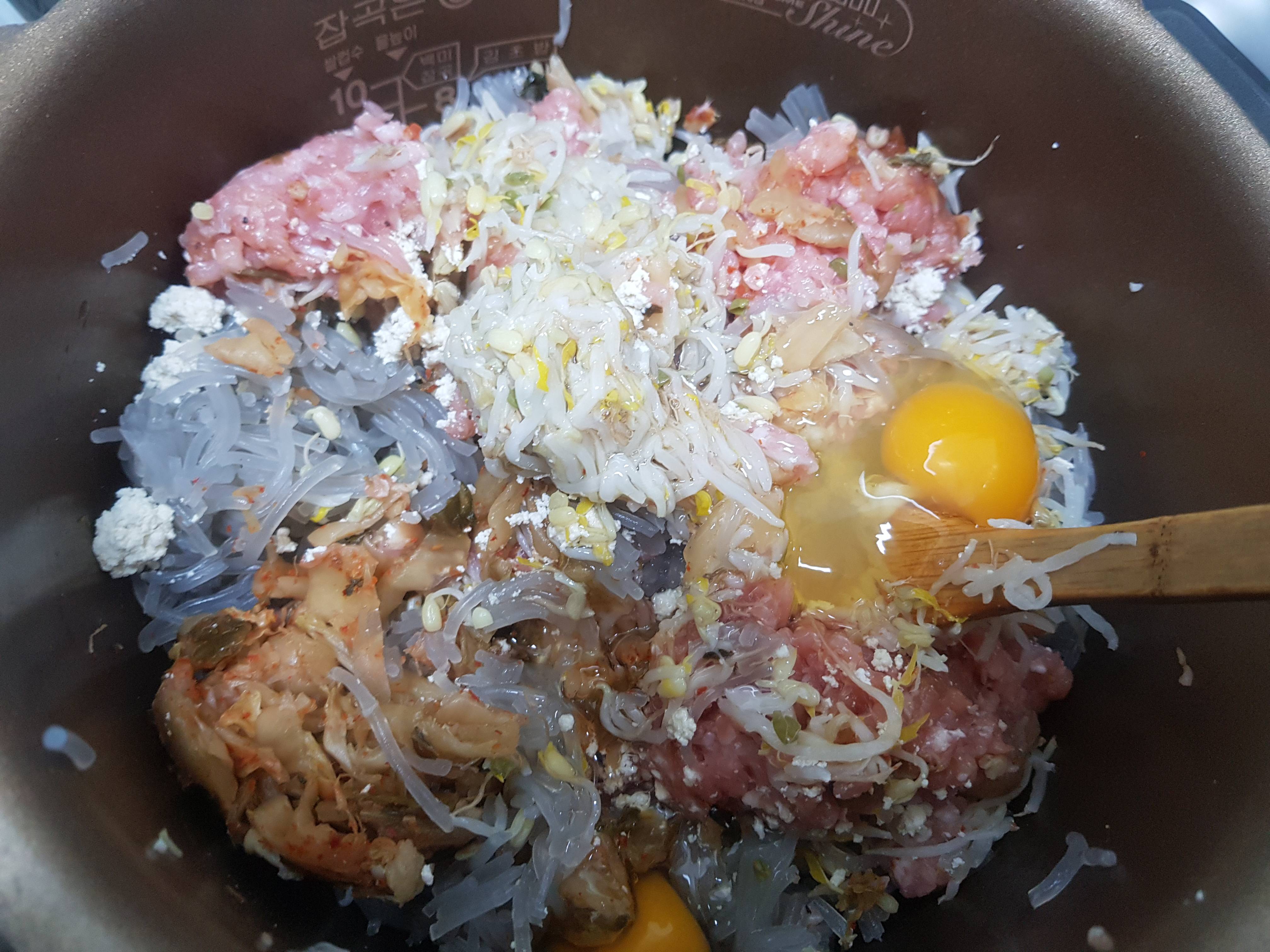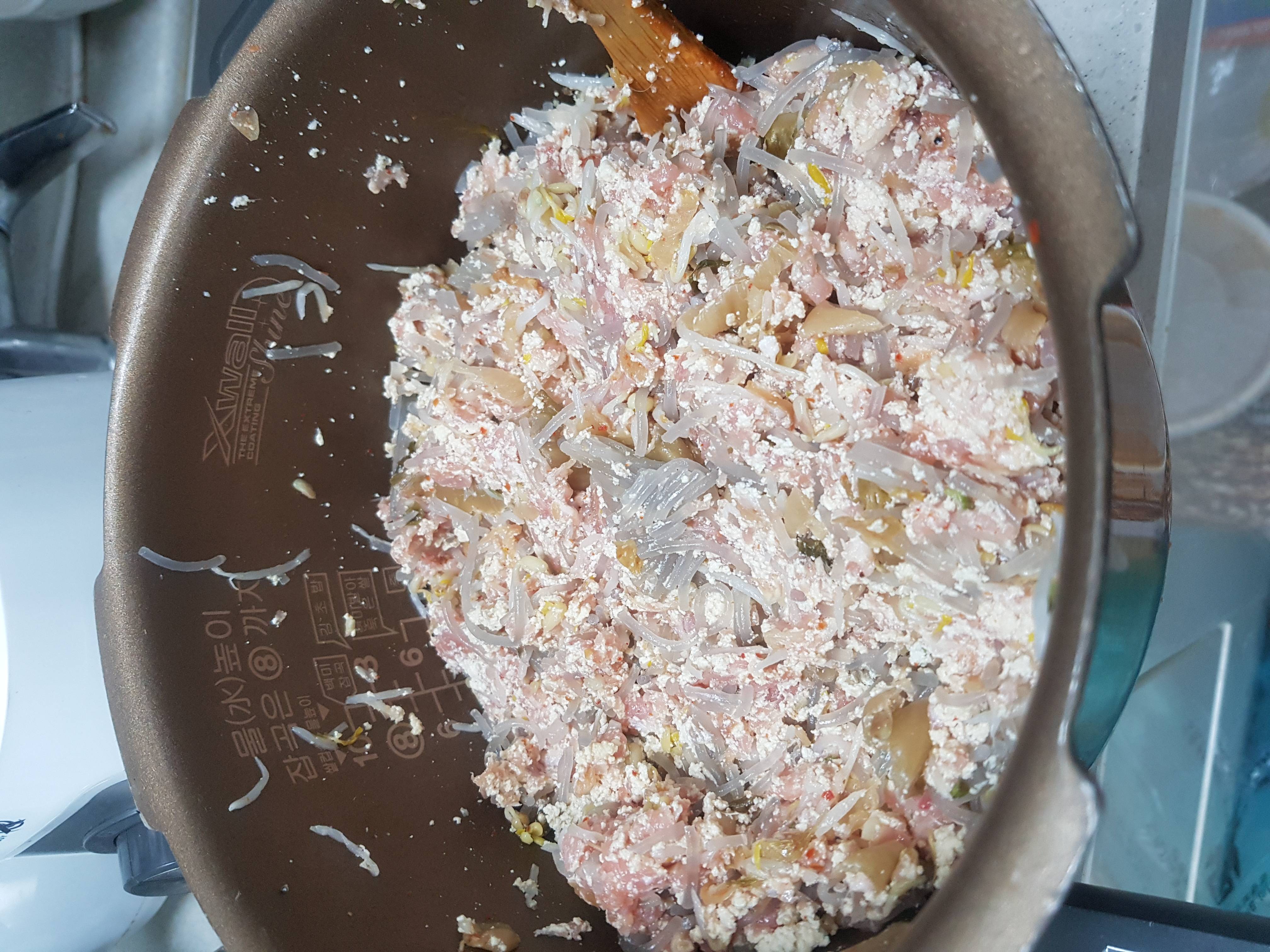 김치썰고 숙주데쳐서 다지고 물기짜낸후