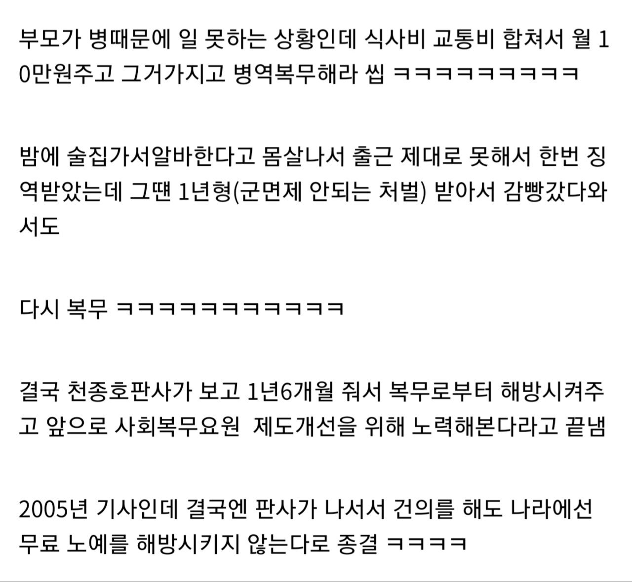 공익이 저때 꼴랑 10만원 받으면서 자기 없으면 생계 유지가 안되서 야간 알바뛴건데