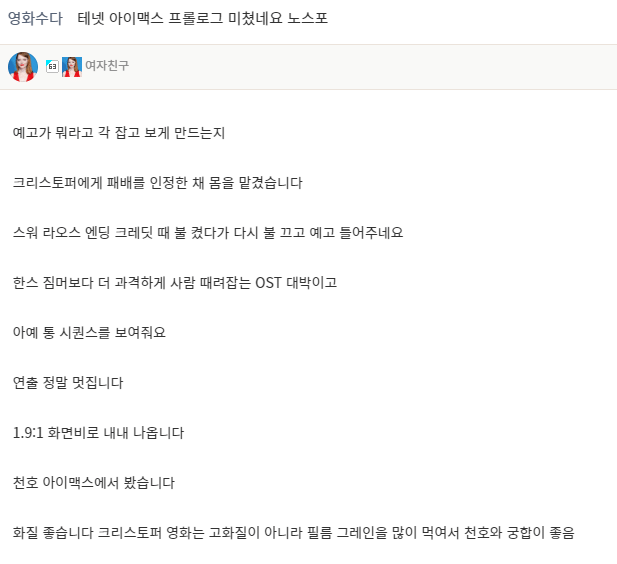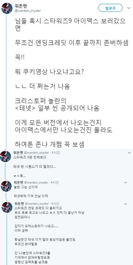 현재 스타워즈: 라이즈 오브 스카이워커를 상영 중인 CGV 아이맥스 관에서 영화가 끝나고 테넷 프롤로그를 틀어준다고 함