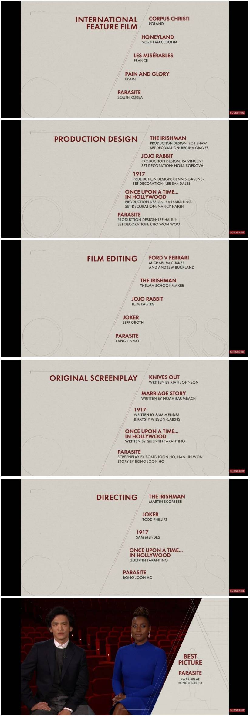 작품상, 감독상, 각본상, 편집상, 미술상, 외국어영화상