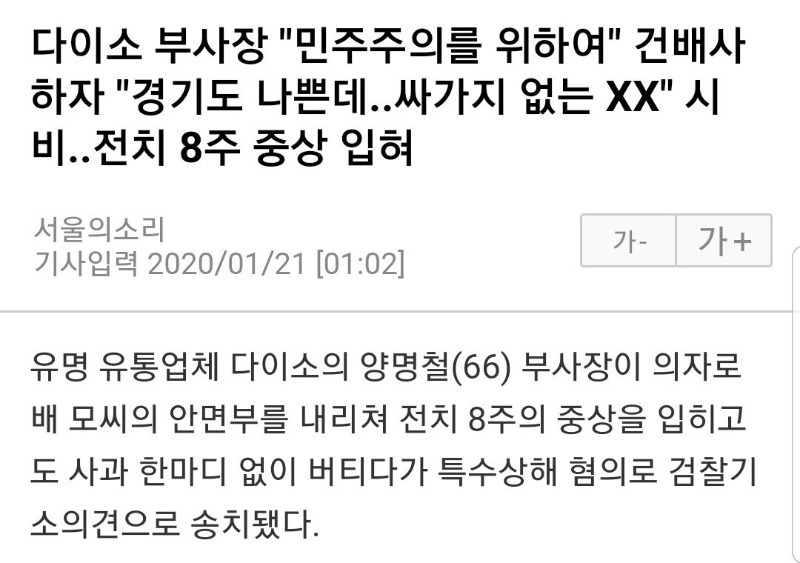 생활용품 유통업체 다이소의 양명철 전 영업총괄 부사장이 특수상해 혐의로 검찰에 기소됐다. 양 전 부사장은 지난해 11월 서울 한 식당에서 합석한 B씨를 의자로 내리치는 등 폭력을 휘두른 것으로 드러났다.