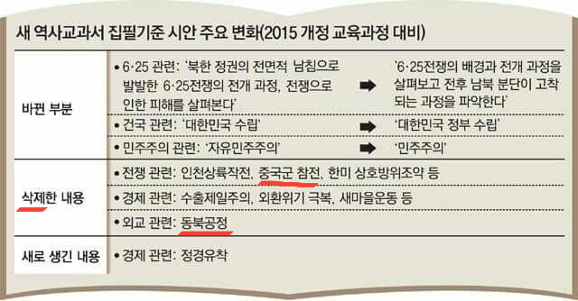 그냥 전쟁관련 내용자체를 다루지 않겠다는 뜻인듯 남침 얘기도 빠졌으니 누가 먼저 공격했는지도 없고 낙동강까지 밀렸다 역전한 이야기도 없고 평양까지 밀었다 다시 밀린 이야기도 없고 걍 6.25란 전쟁이 있었고 3년간 싸우다 휴전했다 끝 으로 퉁치는듯 그걸로 퉁치면 다행인데 보나마나 외세의 어쩌고 하면서 분단은 미국탓 할듯