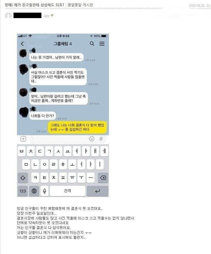 나한테 축의금 부탁한 수많은 사람들이 대구니까 애때문에 뭐 그런얘기 하는 경우는 있어도 우한폐렴때문에 라는 얘긴 한번도 못들어봤는데. 걍 마스크쓰고 가서 사진찍을 때 잠깐 벗으면 되잖아 라는게 너무 안일한 생각일까