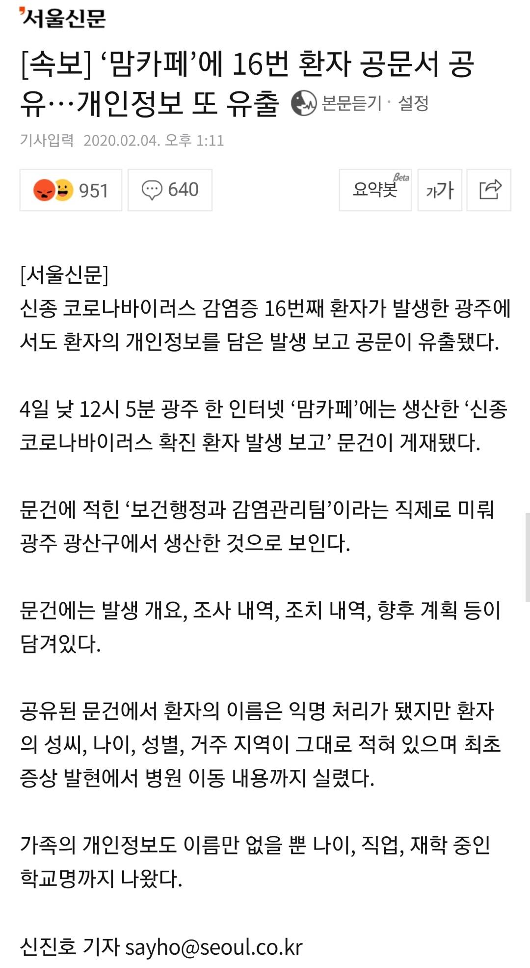 결국 내가 지적하고 싶은것은 정부가 확진된지 하룻밤이 지나도록 제대로된 정보도 안풀고 쉬쉬하고 있으니까 자구책이 나오는게 아니냐는 것