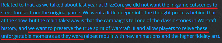 우리는 워크래프트3의 진정한 정신을 보존하여 플레이어들이 그 잊을 수 없는 순간들을 기존의 방식으로 다시 체험하도록 하고 싶습니다