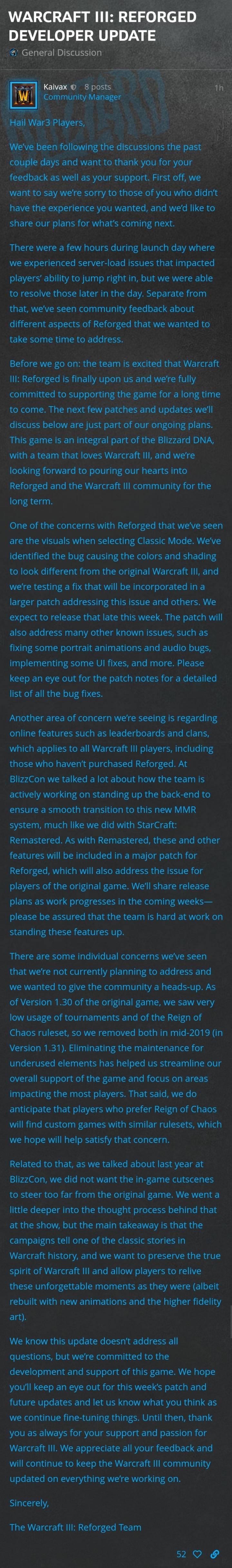 요약 1.미안하다 2.클래식 좆된거부터 고치겠다 3.래더 클랜시스템 추가하겠다 4.레인 오브 카오스는 다들 안하길래 정리했다 5.컷신은 클래식보존하려고 안바꾼거다 6.노력할테니 지켜봐달라