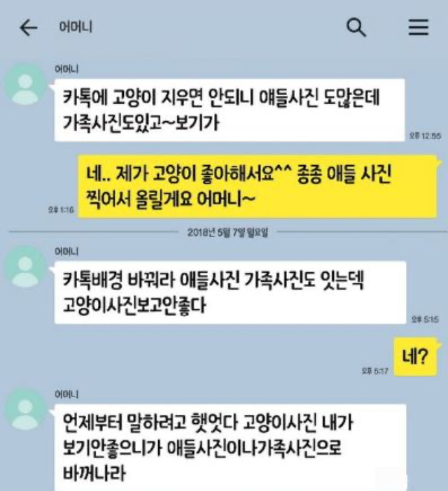 여기서 며느리의 베스트답변은? 1.족까하고 계속고양이프사 2.남편족쳐서 시어머니랑 싸우게만들기 3.고분고분하게 프사바꾼다