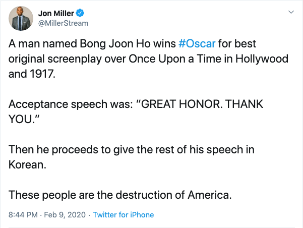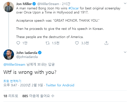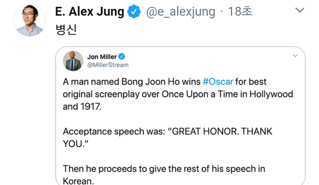봉준호가 원어할, 1917 대신 각본상을 타고 한국어로 수상 소감을 했어.