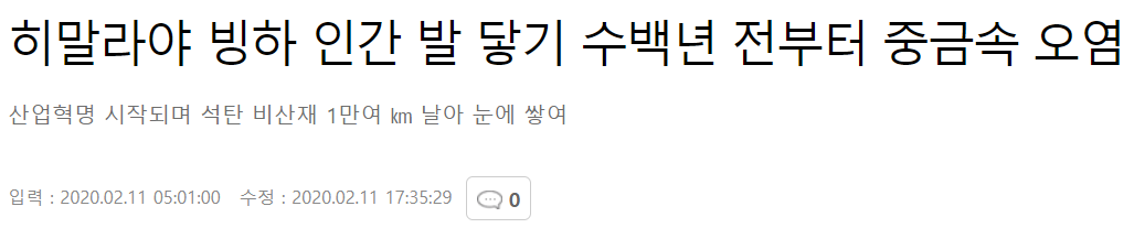 미국 오하이오주립대학(OSU) 버드 극지·기후 연구센터의 연구과학자 파올로 가브리엘리 박사가 이끄는 연구팀은 영국에서 시작된 석탄 사용의 부산물이 겨울철 서풍을 타고 1만㎞ 떨어진 히말라야 중부의 빙하를 오염시켰다는 연구 결과를 미국 국립과학원 회보(PNAS) 최신호를 통해 발표했다.