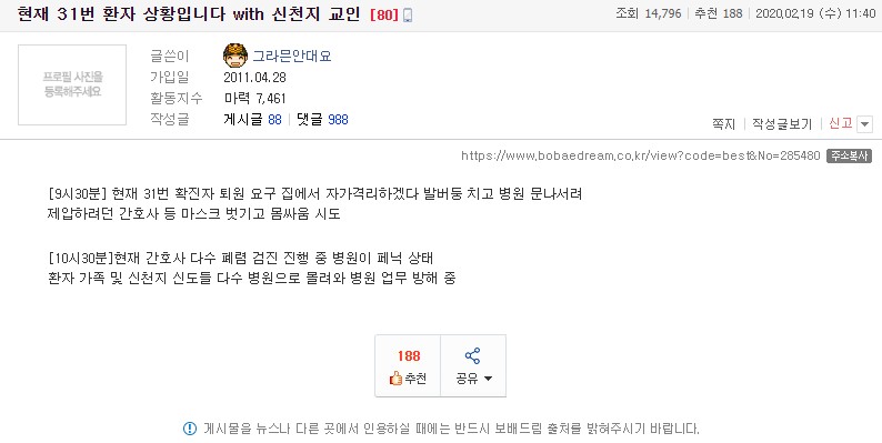 "31번 환자가 퇴원을 요구하며 난동을 부리고, 신천지 신도 다수가 병원으로 몰려왔다"는 글이 메신저 등을 통해 공유되기도 했다. 이 또한 경찰 조사 결과 사실이 아닌 것으로 확인됐다.