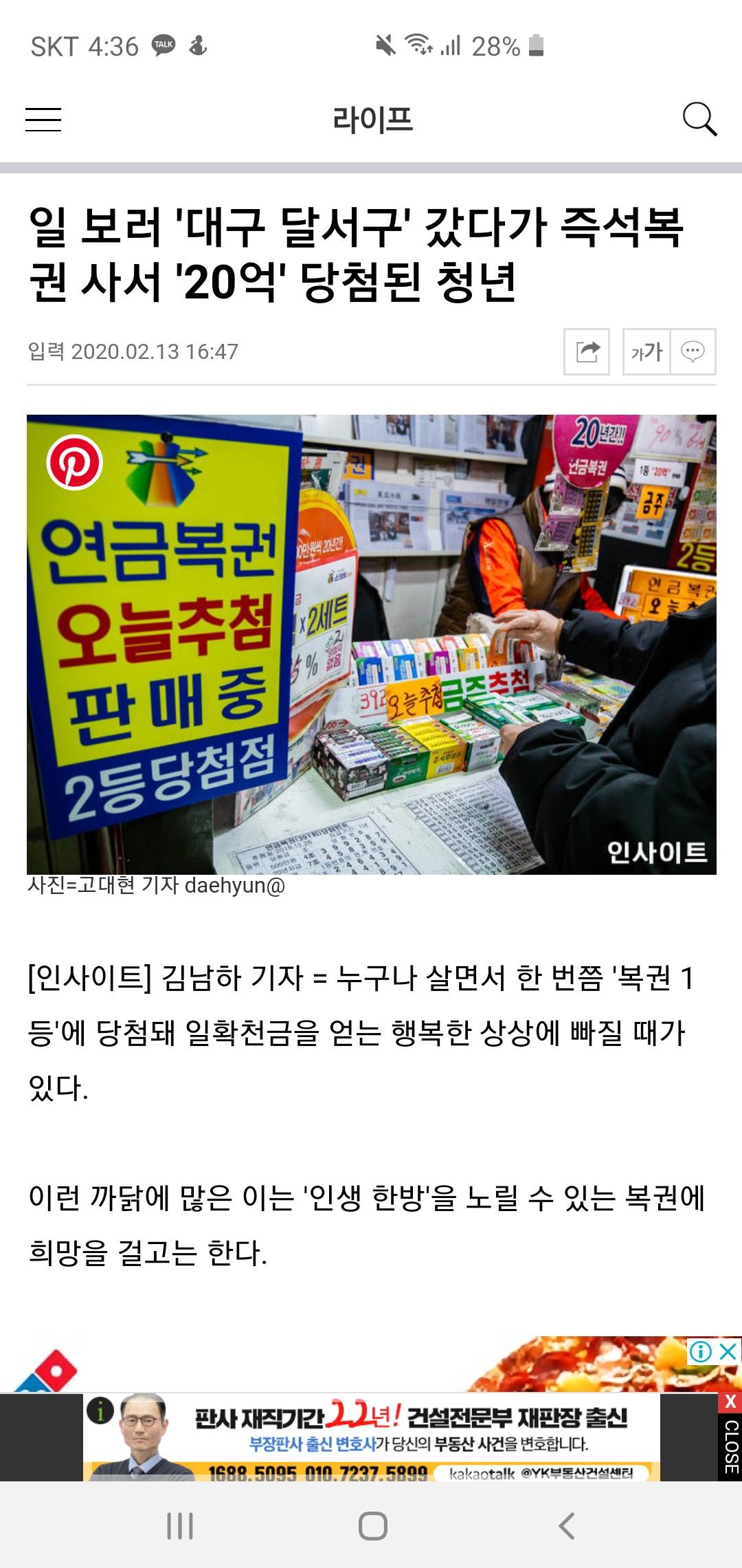 그이야기를 와이프랑 횟집에서 하는데 길건너편cu에서 즉석복권이나살까했는데 ㅋㅋㅋ 와 몇일뒤엔가 다음날거기서 20억스피또터졌네 와이프가 사봐했는데 내가추워서ㅈ귀찮아했는데 ㅅㅂ ㅠㅠ와진짜 횟집바로 맞은편 길건너인데 100미터도안대는거리 와 ㅡㅡ 거기서 20억이터지네