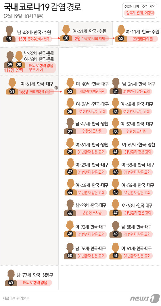 지금 31번만 볼게 아닌거같은데? 29 31 40번 감염경로 확인 안되는게 의미하는게 존나큰데 애시당초 33~39, 41~51이 31번한테서감염된건지 누군가에게 같이 감염된건지도 어케앎?