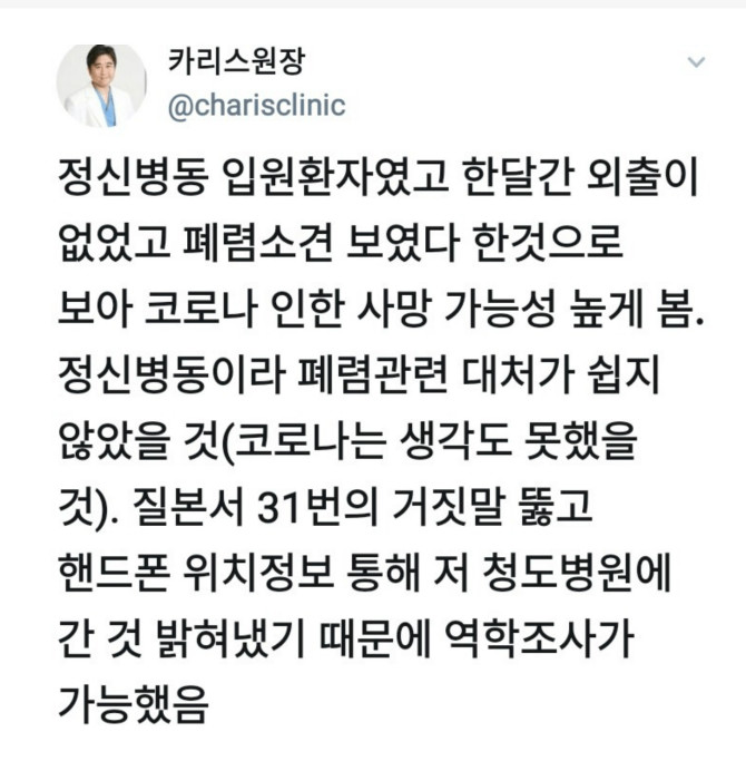 사망자는 20년간 입원중인데 사망후 코로나 양성판정으로 나옴