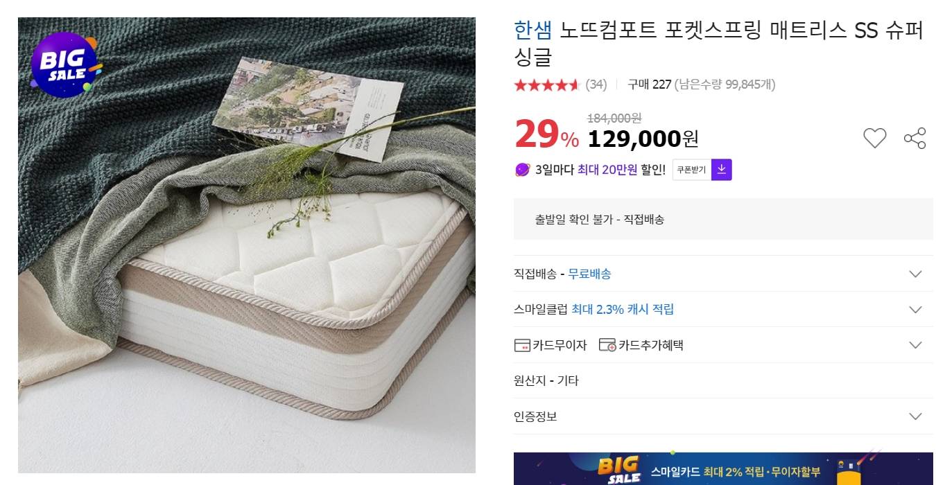 1. 한샘 포켓스프링 매트리스 ss 100,200원