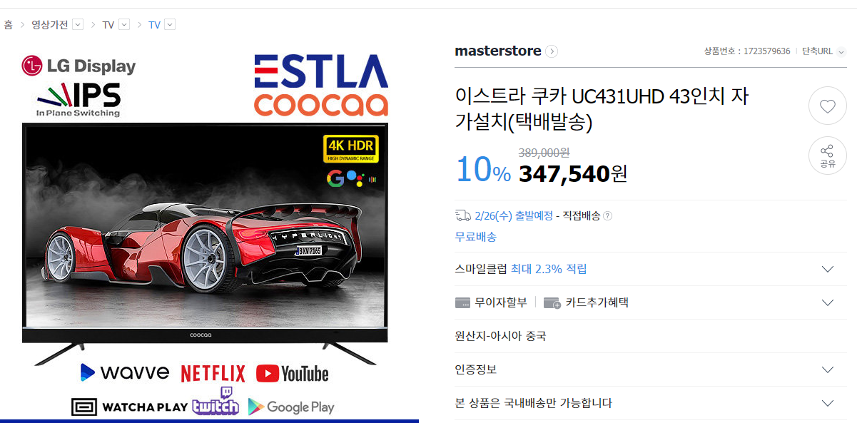 1. 중소기업 스마트TV 구글 안드로이드/크롬캐스트 탑재 - 347,540원