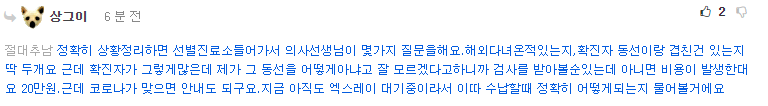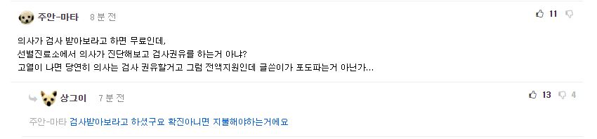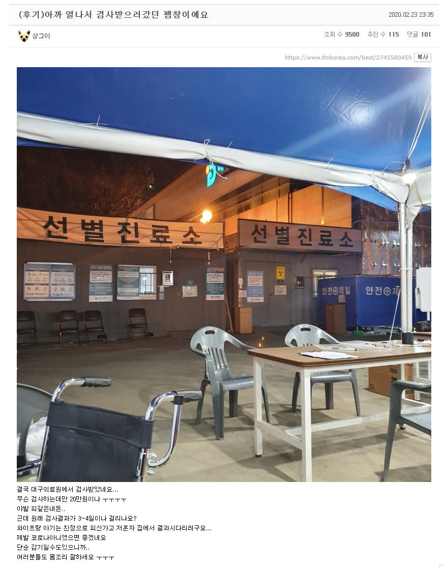 그러니까 의사가 코로나 의심해서 검사 해라하면 무료고 환자 본인이 자의적으로 검사 받으려고하면 20만원이고? 본문의 글쓴이는 자의적으로 검사받은거고?
