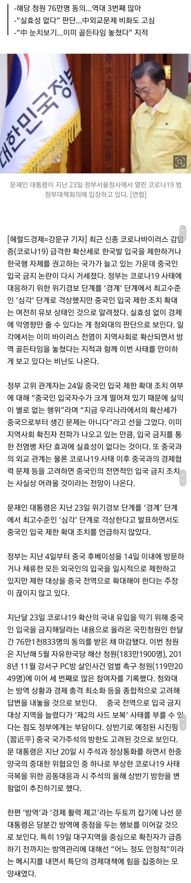 정부 고위 관계자는 24일 중국인 입국 제한 확대 조치 여부에 대해 “중국인 입국자수가 크게 떨어져 있기 때문에 실익이 별로 없는 행위”라며 “지금 우리나라에서의 확산세가 중국으로부터 생긴 문제는 아니다”라고 선을 그었다