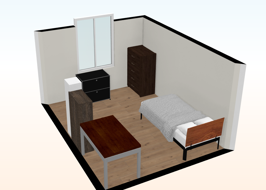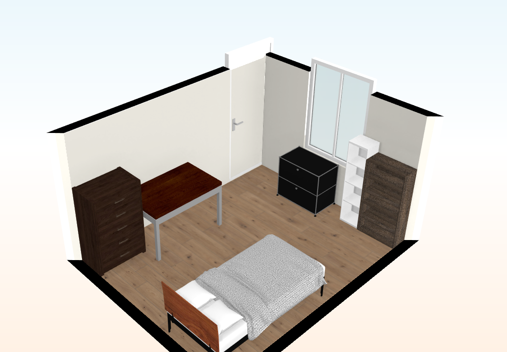 이건 침구를 대각선 방향으로 놓고 책상을 벽으로 붙인거. 사실 좀 별로긴 하다