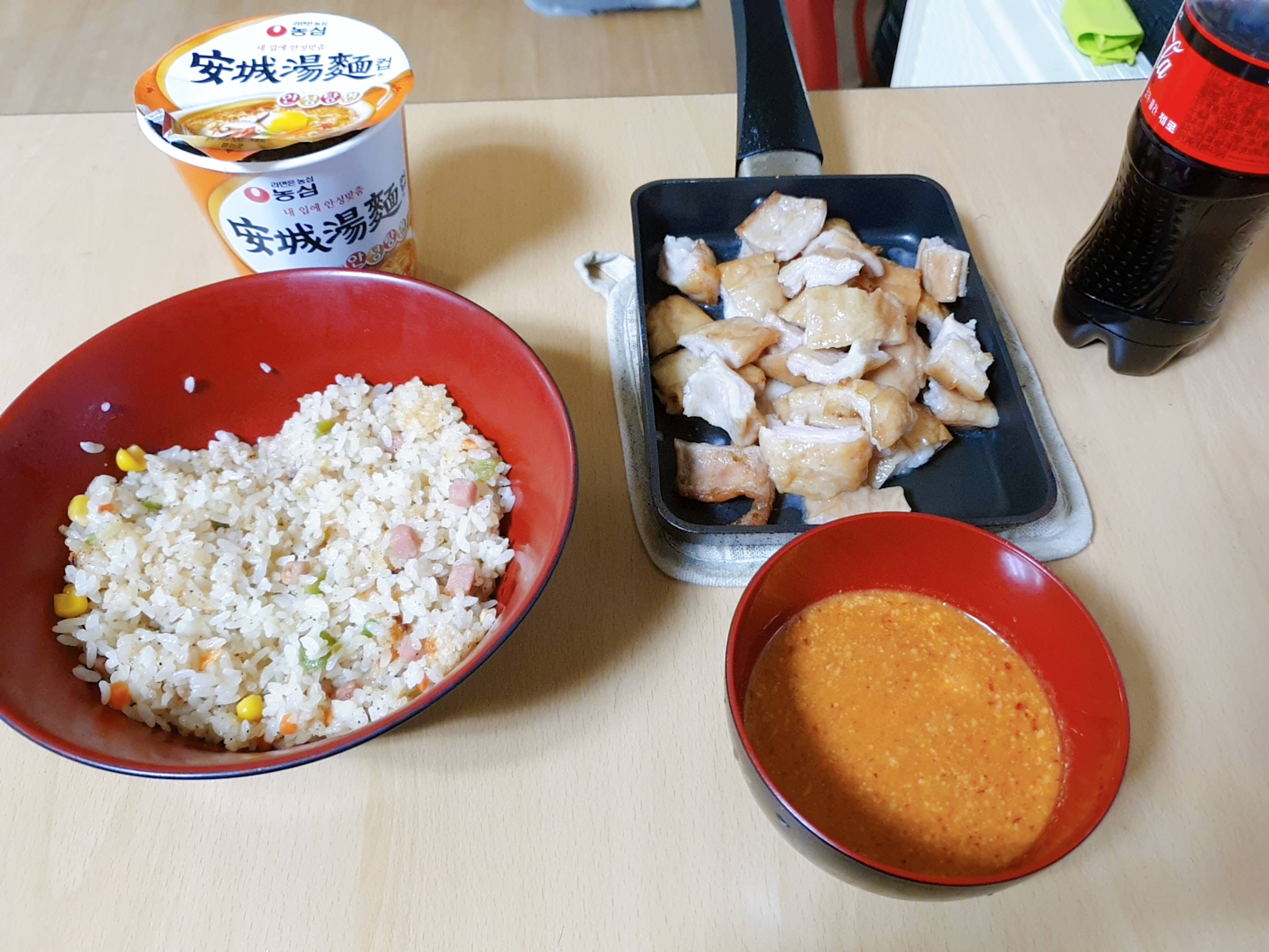 술집이었으면 소주 한잔에 안주 게걸스럽게 먹을 반찬들이네 밥에 라면에 막창 ㄷㄷ