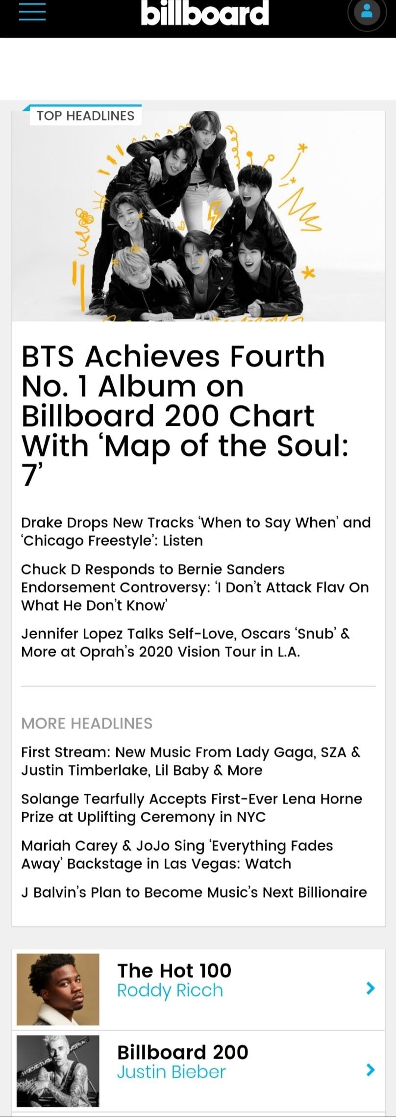 빌보드 메인 페이지에 탑 헤드라인으로 올라와있는 빌보드 200 차트 4연속 1위 소식.
