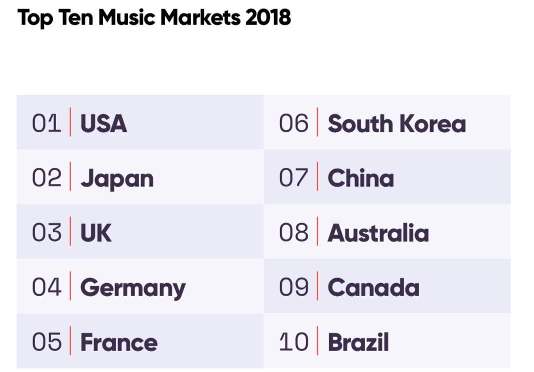 2018년 기준 국가별 음악 시장 순위가 위와 같은데 이중에서 중국, 브라질은 공식 앨범 차트가 없어서
