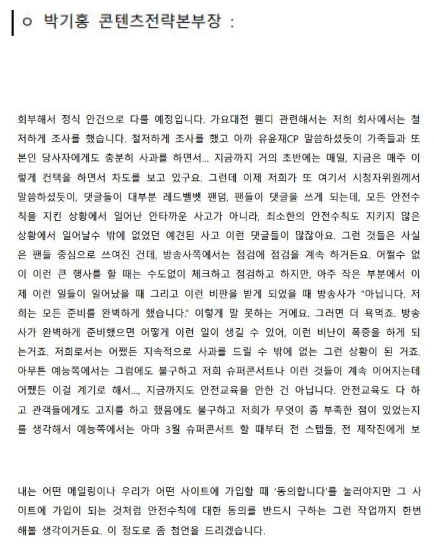 웬디 사고 관련 ㅅㅂㅅ 컨텐츠 전략 본부장 발언.