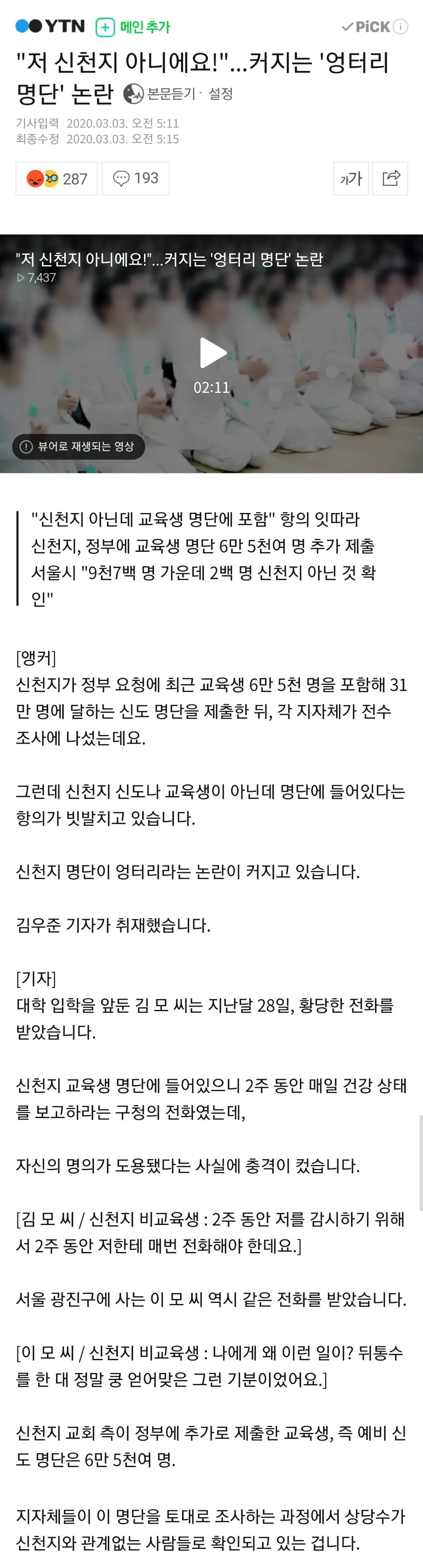 신천지가 처음에 교육생은 정식 신도가 아니라고 명단제출도 안하려고 했는데 정부가 제출하라고 해서 억지로 낸거 아닌가? 그와중에 없는 사람까지 만들어서 냈을거 같진 않은데.. 정황상 아니라고 구라치고 있거나 진짜 자기도 자기가받은 교육이 신천지인지 아직 모르거나