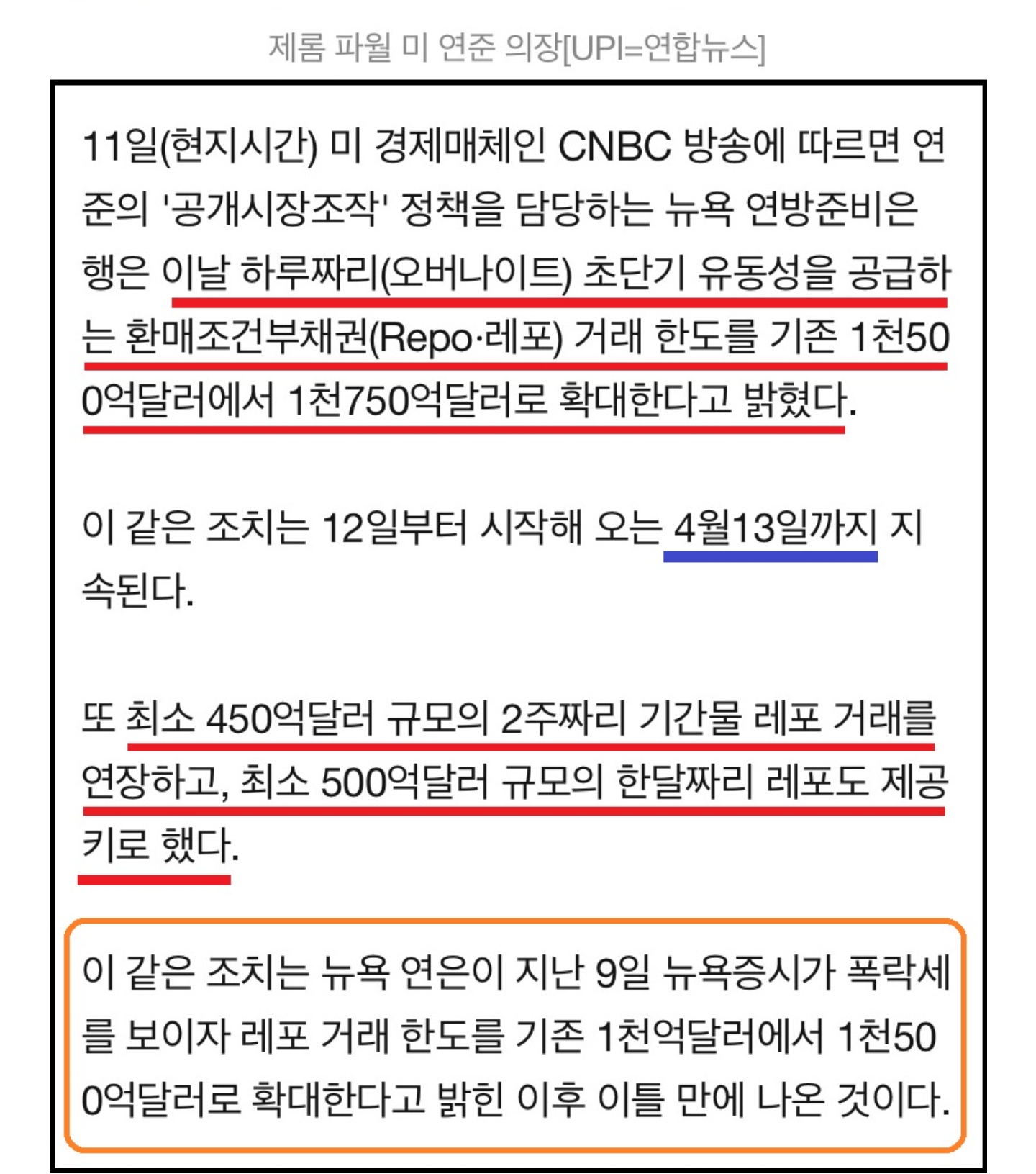 하루짜리 환매조건부채권 = 니가 지금 이 채권을 사면 내가 하루 뒤에 이자까지 쳐서 다시 사줄게 = 하루만에 갚을테니 안심하고 지금 묵히고 있는 돈 하루만 빌려줘 => 이 거래 한도를 확대해서 시중에 돈 더 많이 돌게 하려는 목적 아닐까