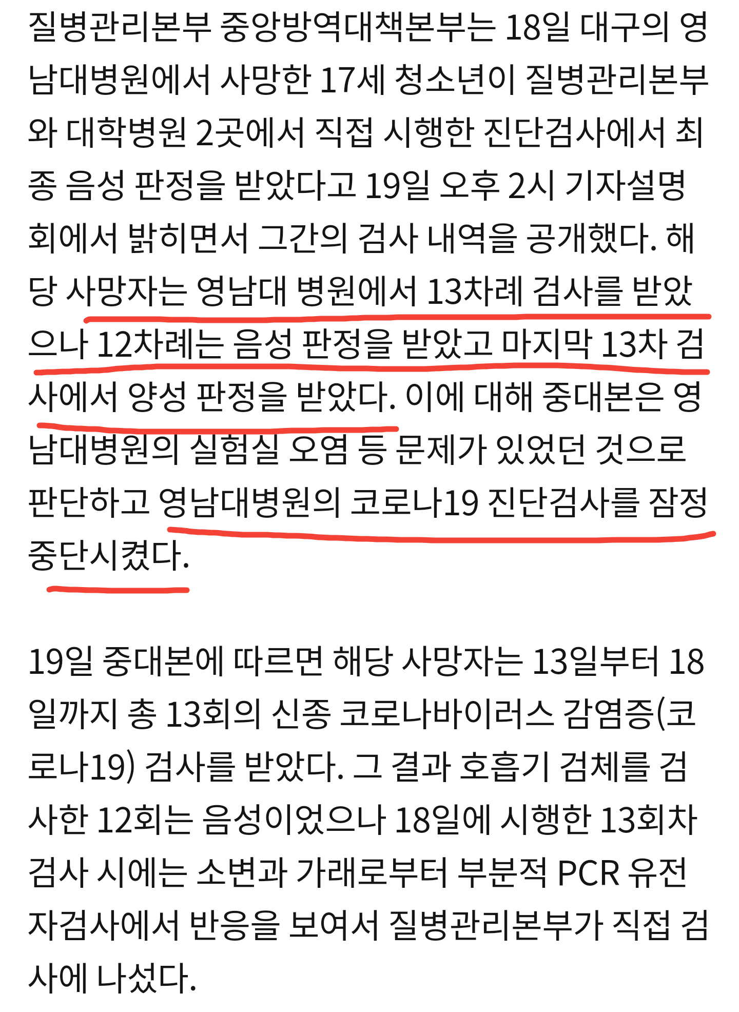 아울러 "영남대병원으로부터 검사 원자료를 제공받아 재판독한 결과, 환자 검체가 전혀 들어가 있지 않은 대조군 검체에서도 PCR 반응이 확인되는 등 실험실 오염 또는 기술 오류 등에 대한 미결정 반응 가능성이 합리적으로 의심됐다"고 덧붙였습니다.