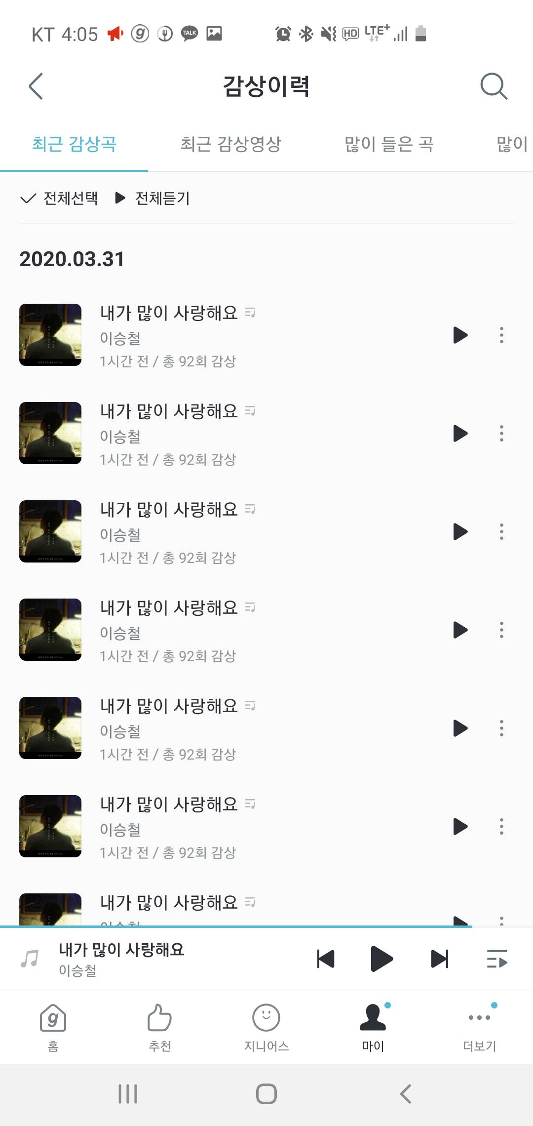 나도 꽂히면 한곡만 들음