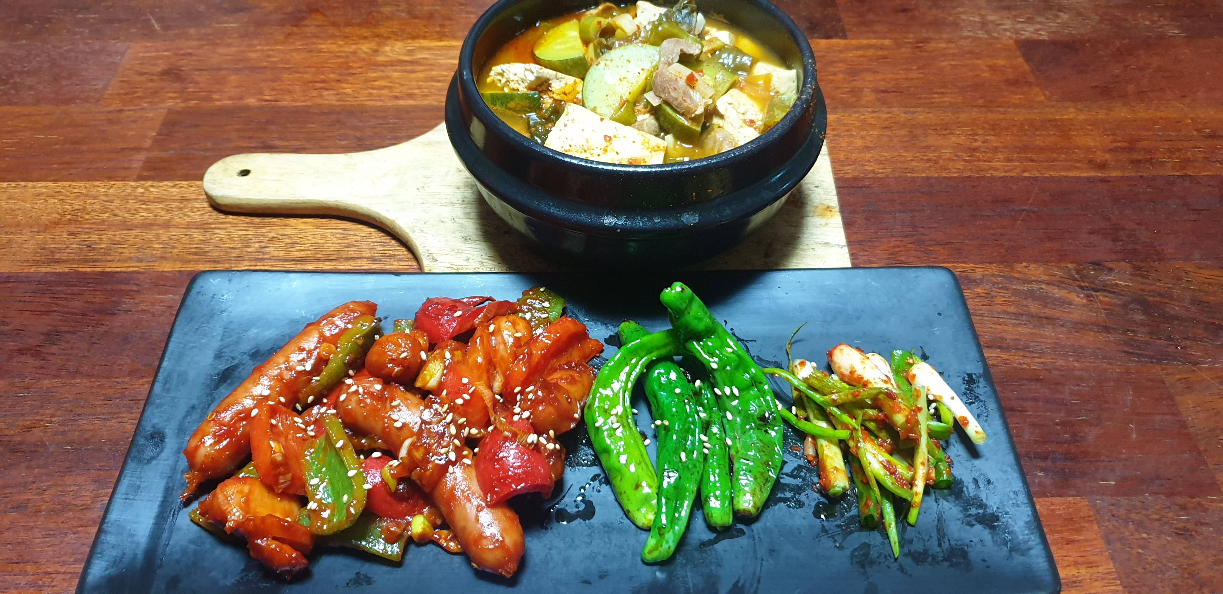 쏘야 돼지찌개 꽈리고추볶음 파김치