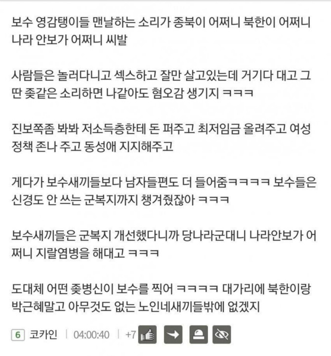 ㅋㅋㅋㅋㅋㅋㅋㅋㅋㅋㅋ 뭐라도 있는거처럼 내 댓글에 거창하게 반박댓글 달길레 뭐 날 설득시켜줄 팩트폭격을 해줄지 기대반 두려움반 가졌더니 이건 뭐ㅋㅋㅋㅋ 그래 죽어라 2018 문재인보다 2019 문재인이 낫다고 실드치고 있어라. 그래봤자 2017박근혜보다 못한걸